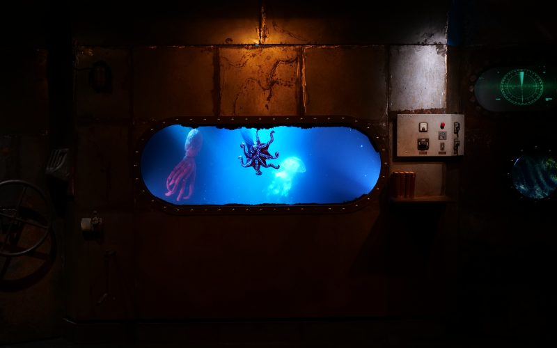 Equipé.e de casque audio, un œil sur le cadran des profondeurs, l’autre à travers le hublot, vous y découvrirez différentes créatures marines rares, peut-être même jamais vues…